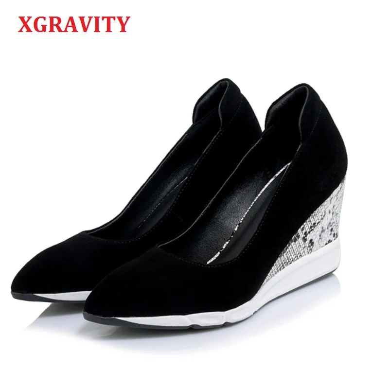 XGRAVITY Wedge Genuine Leather Lady High Heel Dress Wedges Snakeskin Heel Pointed Toe Woman High Heels Ladies Party Shoes A062